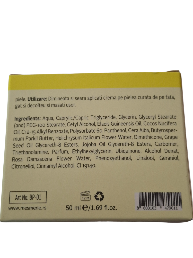 Panthenol Koenzim Q10 & Smilje krema - krema izuzetno lagane i ugodne teksture. Ova krema s moćnim ekstraktom smilja brzo i efikasno regenerira kožu lica i djeluje protiv starenja (anti-age, regenerating). Nakon redovne upotrebe ove kreme, koža lica postaje nježnija i zategnutija, a bore značajno ublažene.