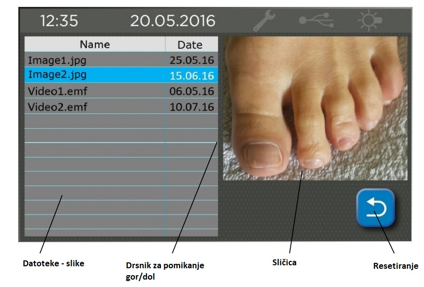Možete koristiti preglednik za pregled slika u JPG formatu. Video zapise u EMF formatu možete reproducirati s USB sticka. EMF datoteka poseban je Windows format datoteke dizajniran za pohranu velike količine slika za visokokvalitetni ispis. Ako je moguće, koristite priloženi USB (4 GB). USB stickovi trećih strana uglavnom su kompatibilni s uređajem. Uzorci datoteka učitavaju se na ovaj priloženi. Brisanje ovih datoteka ne utječe na rad uređaja. Imajte na umu da u direktoriju za preglednik slika može biti najviše 100 datoteka. Spremanje više od 100 datoteka nije moguće. Ako želite spremiti više od 100 slika, morat ćete prethodno izbrisati neke slike ili datoteke ili ih spremiti na drugi medij, kao što su; USB, u oblak, CD itd.