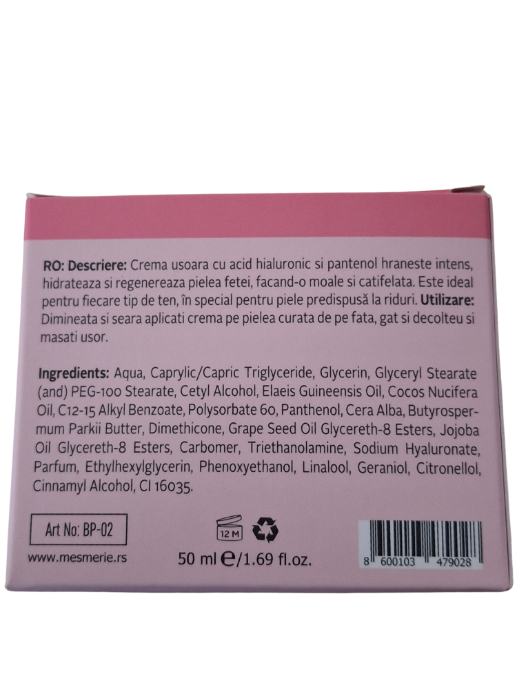 Anti-age Panthenol Hyaluron krema je lagana krema sa hijaluronom za svakodnevnu njegu kože. Preporučuje se svim tipovima kože, bez obzira na godine, koji žele jedru, glatku I mladenačku kožu lica.