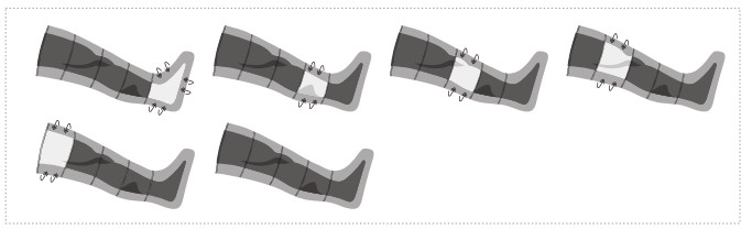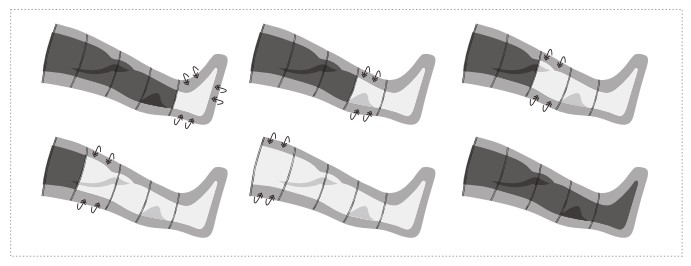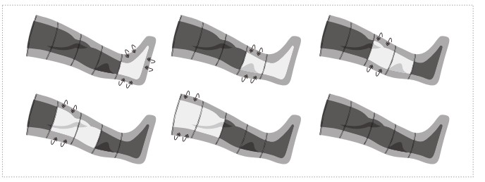 Oporavak od vježbe: Idite od distalnog do proksimalnog kraja u ciklusu, masažer napuhuje/ispuhuje zrak (kontrahira/opušta poput mišića) uzastopno iz komore 1 i pomiče se natrag svake dvije komore, ciklička kompresija za poticanje cirkulacije krvi i optimizaciju metabolizma. Idealan je za duboko opuštanje mišića.