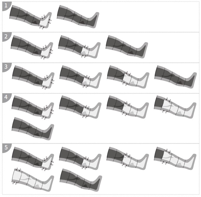 Dubinska njega: masažni uređaj izvodi pritisak od distalnog do proksimalnog kraja iz komore 1 u komoru 5, jednu za drugom. Ovaj način je idealan za osobe, koje mnogo sjede - koji imaju krutost mekih tkiva.