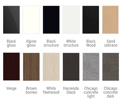 Vezni del za frizersko ogledalo - Bristol pa ponuja tudi možnost izbire barve. Na spodnji sliki je prikazanih vseh 12 barv in vzorcev med katerimi lahko izbirate.