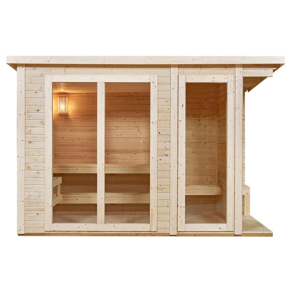 Velika vidljiva površina kroz staklene prozore i sigurnosna staklena vrata uključivo s močnim električnim grijačem za saunu snage 8 kw s individualnim kamenima za saunu i zaštitnim rubom. Visokokvalitetni, izdržljivi masivni drveni elementi i konstrukcija od 40 mm debelog izolacijskog drveta smreke u prirodnoj boji.